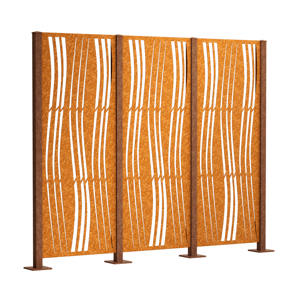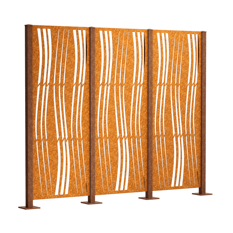 Our "Arno" complete privacy fence set features a dynamic, all-over wave pattern that looks very modern. Choose between powder-coated metal (duplex process) or Corten steel. The privacy screen panels measure 158 x 60 cm each.