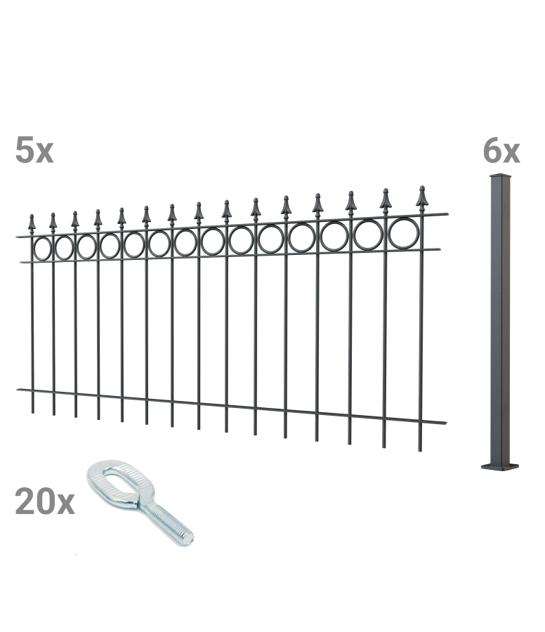 "Belluno" has a standard width of 192.5 cm and a height of 90 cm. It is characterized by stylish elegance and a special charm. Highlights include the circular decorative elements and pine-shaped finials. The sturdy fence is handcrafted from solid, weather-resistant wrought iron.