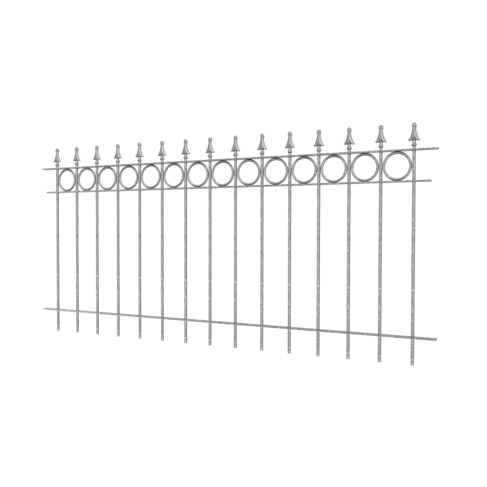 Stylish elegance with a special charm: Our "Belluno" fence captivates with its circular decorative elements and pine-shaped finials. With a standard width of 192.5 cm and a height of 90 cm, the "Belluno" metal fence stylishly frames your garden. Handcrafted from solid, weather-resistant wrought iron, you will enjoy "Belluno" for years to come. Each "Belluno" fence panel has 15 bars spaced 11 cm apart. The beautifully shaped pine-shaped finials are 9.5 cm high. The circular decorative elements measure 11.2 cm in diameter. You can purchase the "Belluno" fence panel directly from us as the original manufacturer. We prioritize the highest quality, design standards, and customer satisfaction.