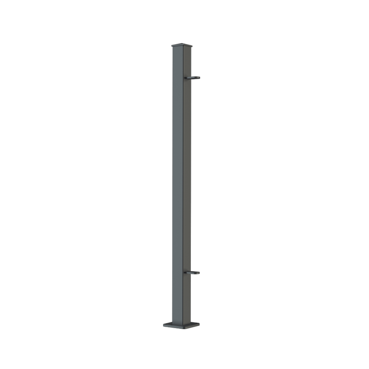 The posts are bolted to the substrate using a 10 x 10 cm mounting plate. A cap provides an attractive finish to the post. Connecting tabs on the railing elements and posts ensure easy installation with M8 screws and nuts.