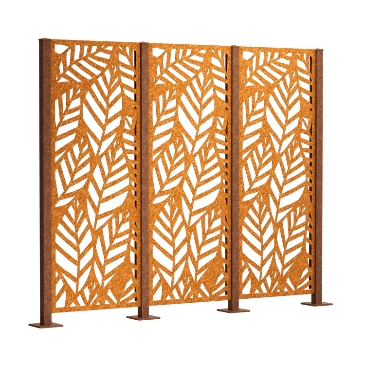 Our "Livenza" complete privacy fence set features an elaborate, all-over leaf design. Choose between powder-coated metal (duplex process) or Corten steel. The privacy screen panels measure 158 x 60 cm each.