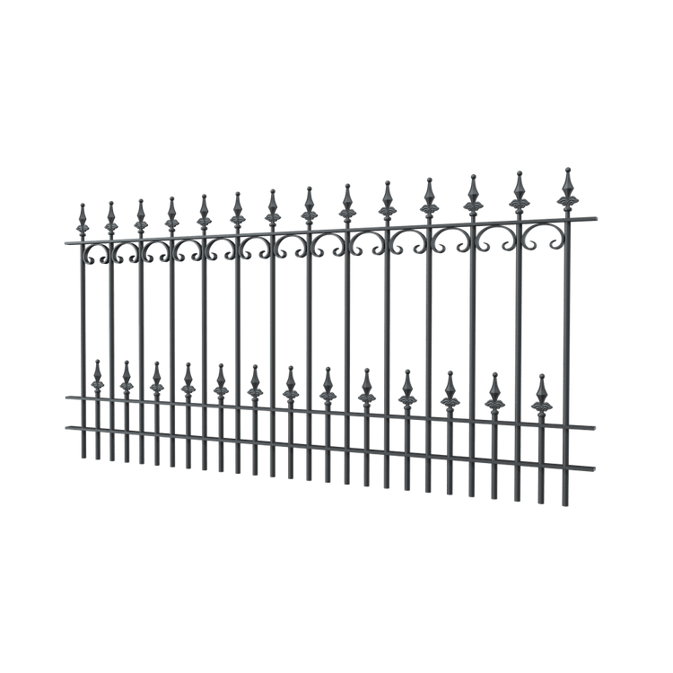 The "Lucca" fence panel consists of three rails and 14 long and 13 short bars. The decorative finials in the shape of spherical fleurs-de-lis are 13.5 cm high.