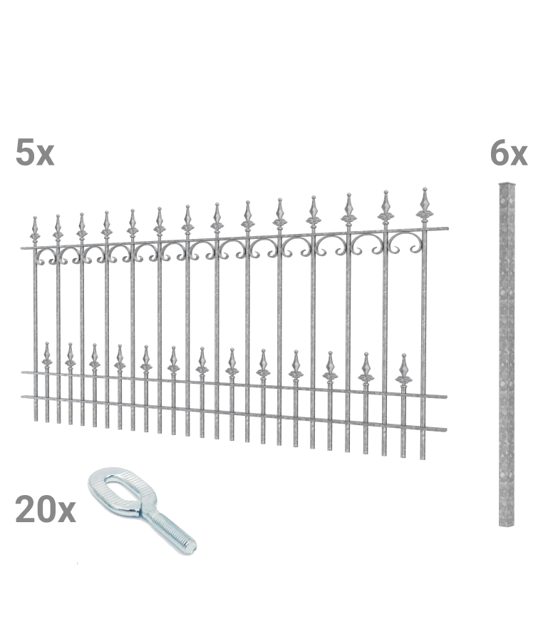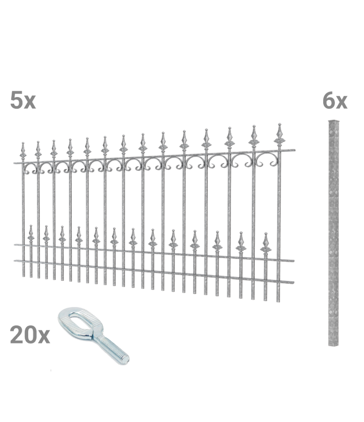 With "Lucca," delicate romanticism meets sturdy wrought iron. "Lucca" has a standard width of 192.5 cm and a height of 90 cm. The fence impresses with its elaborate design, curved C-shaped decorative elements, and elegant finials in the shape of spherical fleurs-de-lis. It is made of solid, weatherproof wrought iron.