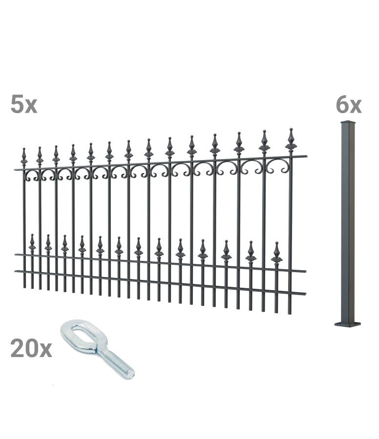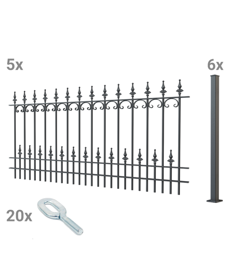 With "Lucca," delicate romanticism meets sturdy wrought iron. "Lucca" has a standard width of 192.5 cm and a height of 90 cm. The fence impresses with its elaborate design, curved C-shaped decorative elements, and elegant finials in the shape of spherical fleurs-de-lis. It is made of solid, weatherproof wrought iron. The fence kit includes: • 5 x 192.5 cm fence panels, model "Lucca" • 6 x posts for screwing or concreting in • 20 x slotted screws for steel posts