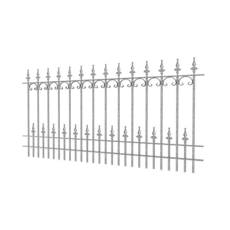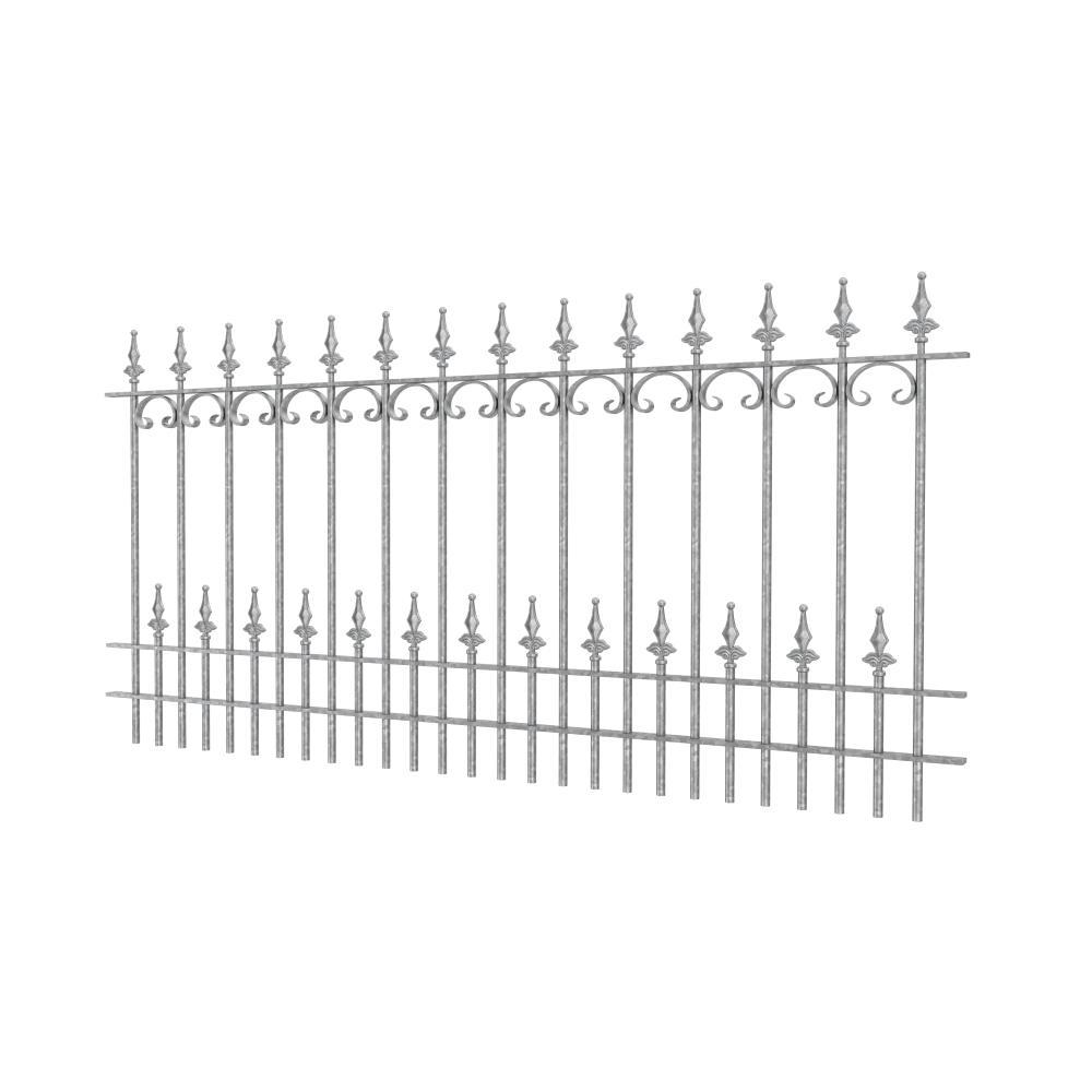 The "Lucca" fence panel consists of three rails and 14 long and 13 short bars. The decorative finials in the shape of spherical fleurs-de-lis are 13.5 cm high.