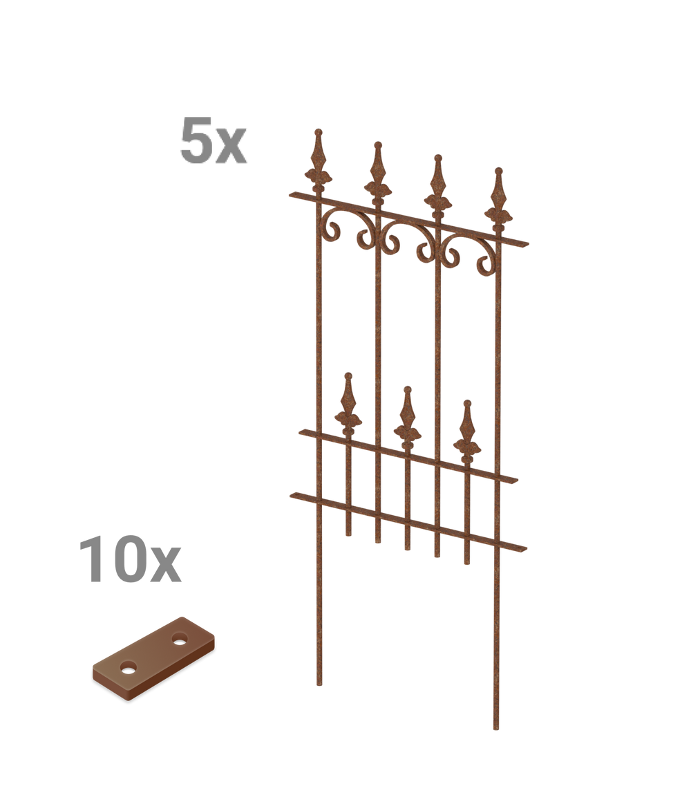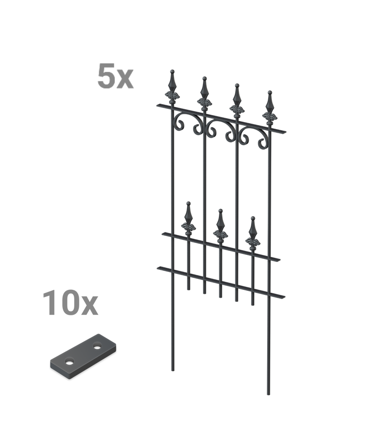 With its artistic C-shaped decorations and elegant "Ball Lilies" finial, our popular "Lucca" fence model adds a special touch to your garden. This practical modular fence set, available at a great price, includes five fence panels, each measuring 50 cm wide and 105 cm high (including finial and ground anchors). Assembly is particularly easy: the high-quality metal panels are simply inserted into the ground and securely screwed together using the included connectors.