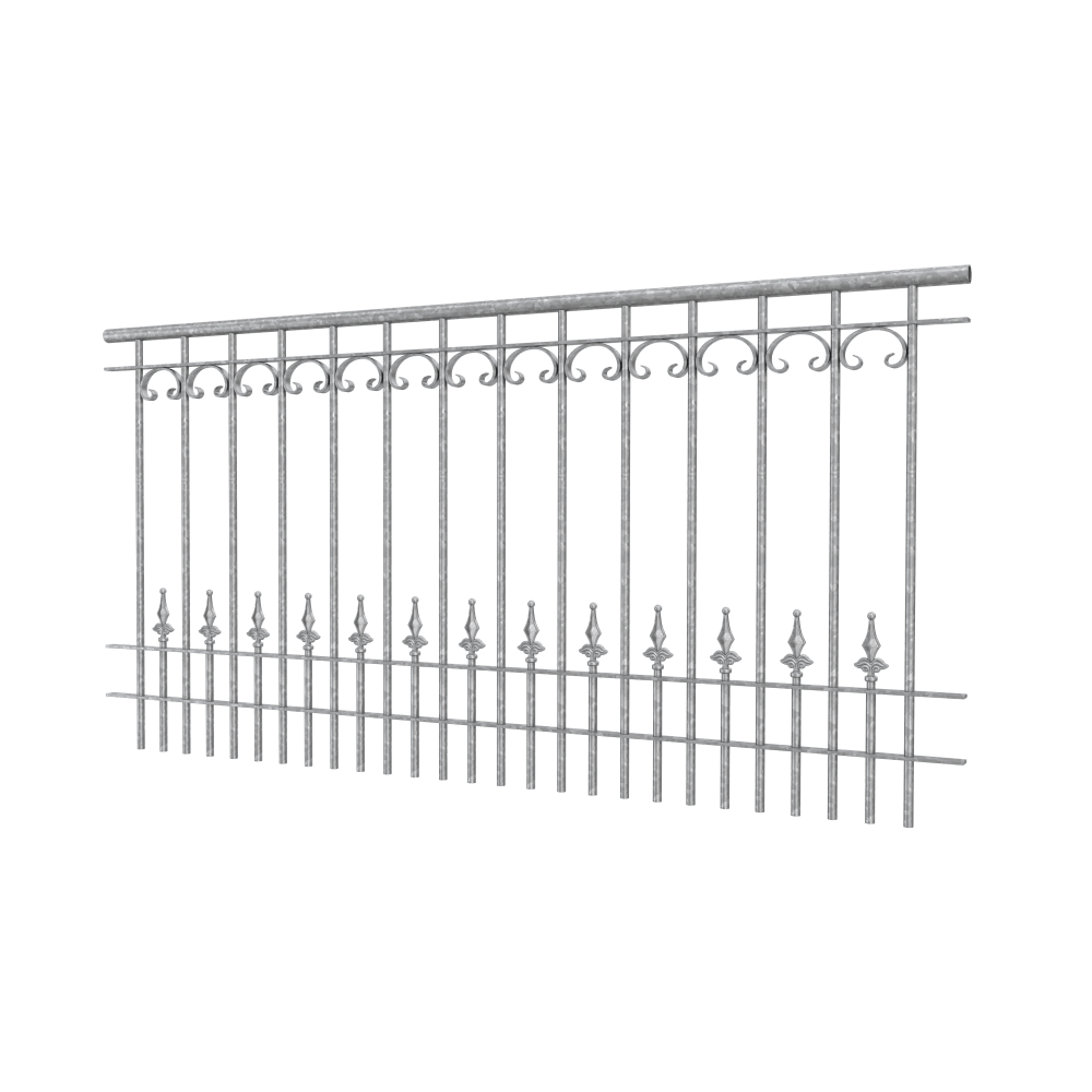 The intricately designed railing has three crossbars, 14 long and 13 short balusters. The balusters have a diameter of 1.6 cm. An ergonomically shaped handrail with a diameter of 3 cm completes the design.
