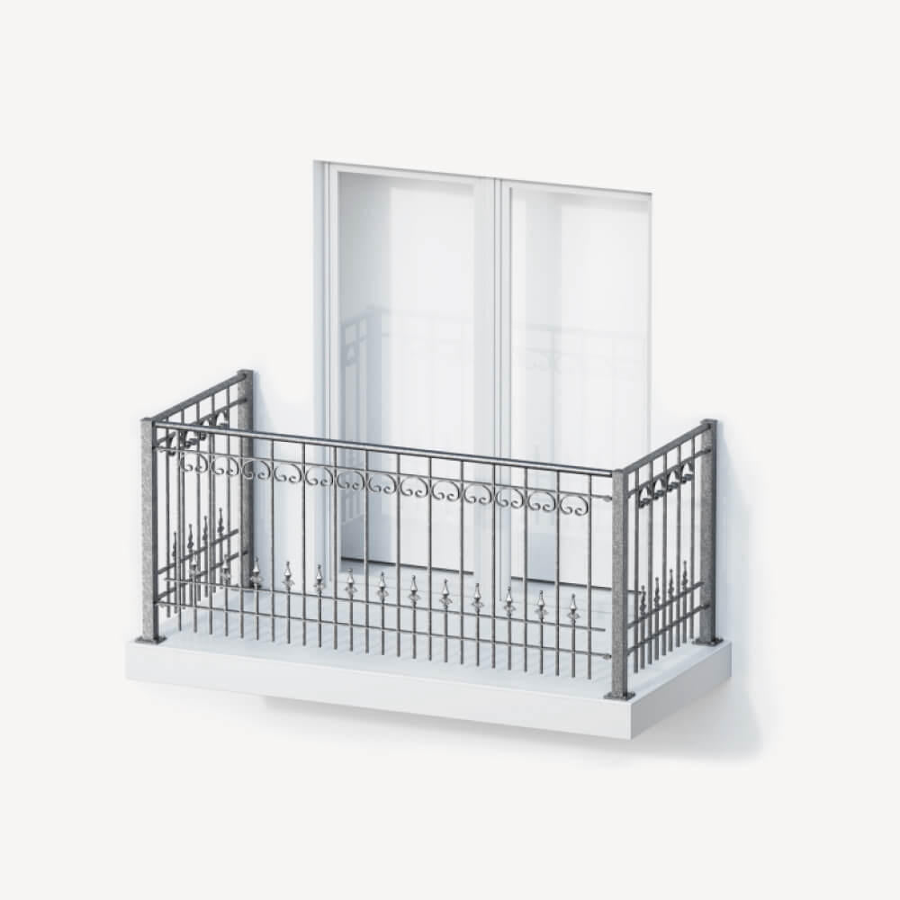 Our "Lucca" railing features numerous details such as intermediate bars, decorative fleur-de-lis finials, and C-shaped ornaments. Its nostalgic design will make your balcony a real eye-catcher! The railing width is 192.5 cm or 96 cm, and the height is 90 cm (before installation). The "Lucca" balcony railing is handcrafted from solid, weather-resistant wrought iron.