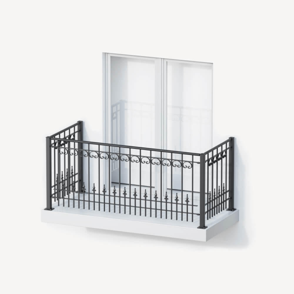 Our "Lucca" railing features numerous details such as intermediate bars, decorative fleur-de-lis finials, and C-shaped ornaments. Its nostalgic design will make your balcony a real eye-catcher! The railing width is 192.5 cm or 96 cm, and the height is 90 cm (before installation). The "Lucca" balcony railing is handcrafted from solid, weather-resistant wrought iron.