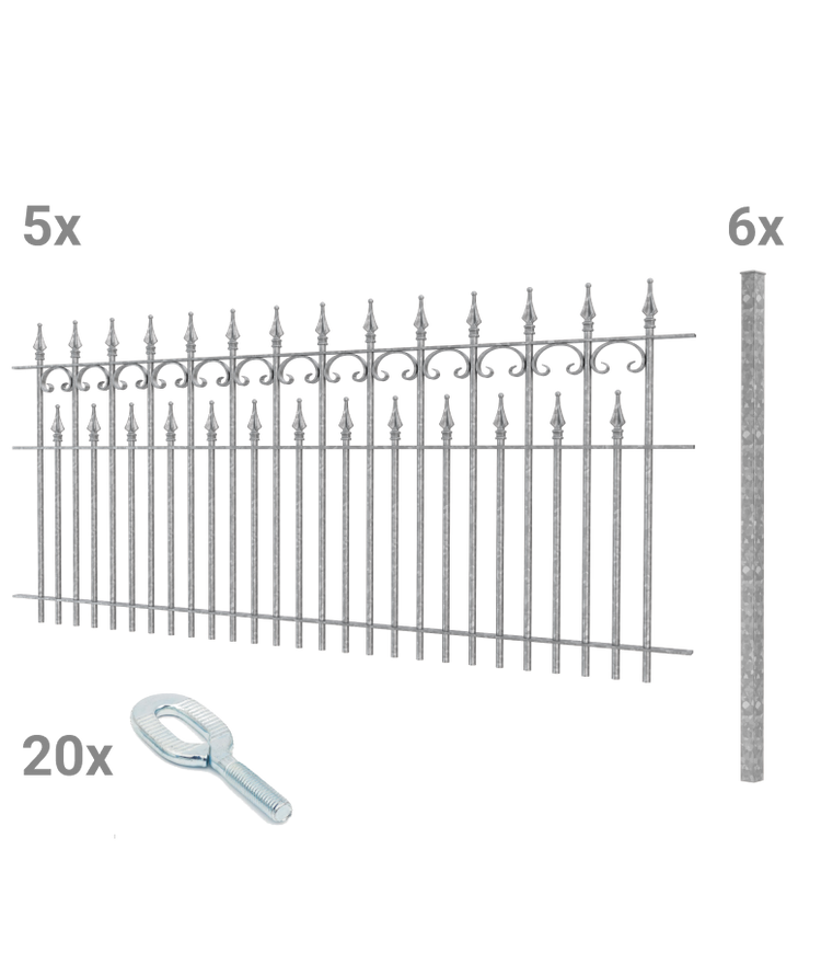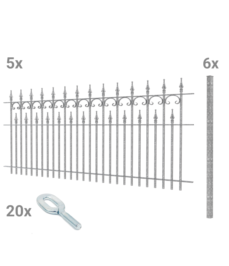 "Lugano" possesses a nostalgic charm with its intricate details. Delicate C-shaped decorations and numerous finials are a particular eye-catcher. The "Lugano" fence has a standard width of 192.5 cm and a height of 90 cm. Handcrafted from high-quality wrought iron, it is reliably weather-resistant.