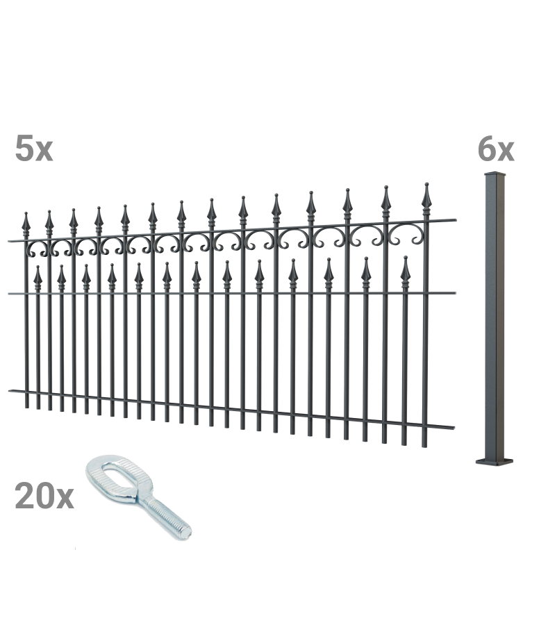 "Lugano" possesses a nostalgic charm with its intricate details. Delicate C-shaped decorations and numerous finials are a particular eye-catcher. The "Lugano" fence has a standard width of 192.5 cm and a height of 90 cm. Handcrafted from high-quality wrought iron, it is reliably weather-resistant.