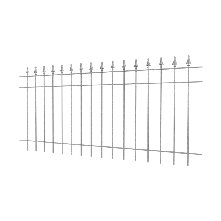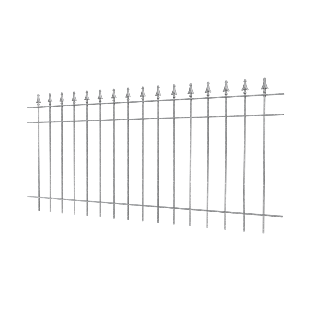 Crowned with elegant pine tips: The "Pino" fence model combines understated elegance with beautifully shaped details. The pine-shaped finials are a real eye-catcher. Despite its delicate appearance, the "Pino" metal fence offers impressive stability. This garden fence is handcrafted from weather-resistant wrought iron. The standard width per fence panel is 192.5 cm and the standard height is 90 cm.