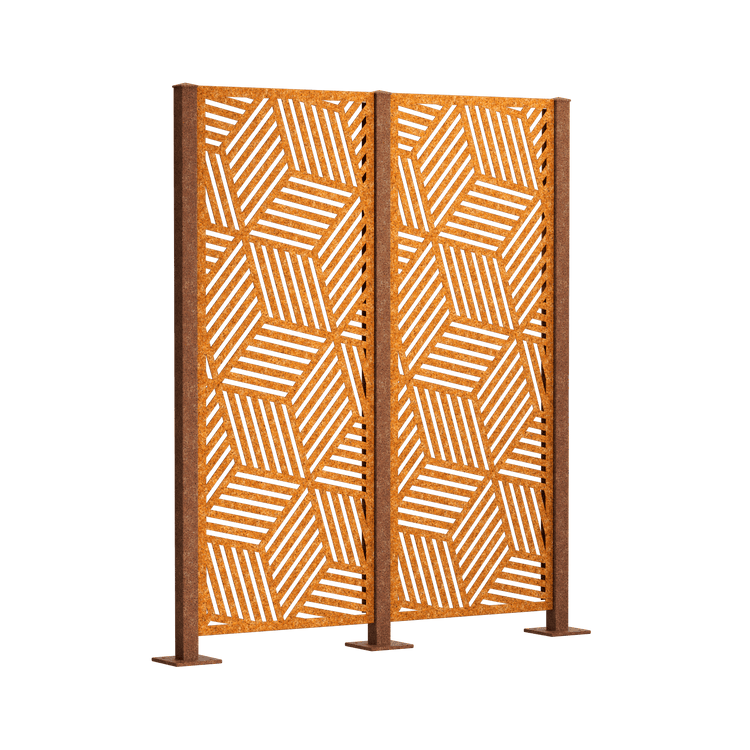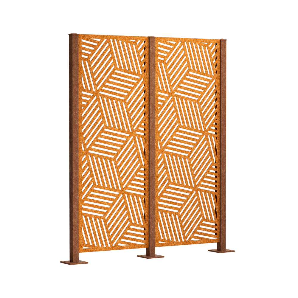 Our "Reno" complete privacy fence kit features a modern, all-over diamond pattern that adds a stylish touch to your garden. Choose between powder-coated metal (duplex process) or Corten steel. The privacy screen panels measure 158 x 60 cm each.