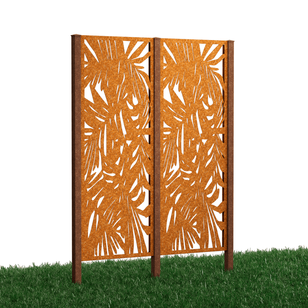 Our "Tanaro" privacy fence complete kit is a special decorative feature thanks to its all-over, exotic palm pattern. Choose between powder-coated metal (duplex process) or Corten steel. The privacy screen panels measure 158 x 60 cm each.