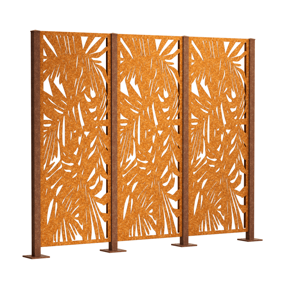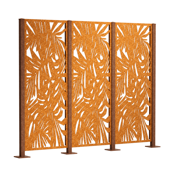Our "Tanaro" privacy fence complete set is a special decorative feature thanks to its all-over, exotic palm pattern. Choose between powder-coated metal (duplex process) or Corten steel. The privacy screen panels measure 158 x 60 cm each.